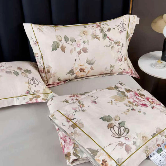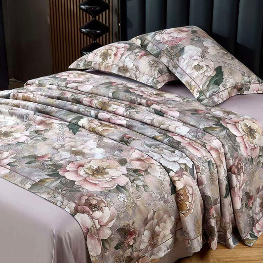 Premium šilkinio Tencelio patalynės komplektas su paklode - "Šilko žiedai" (Prigesinta rožė)