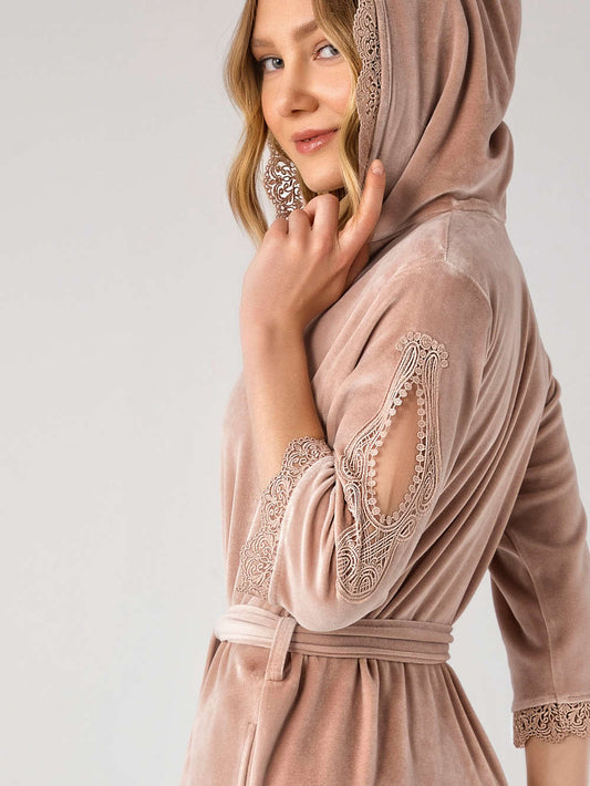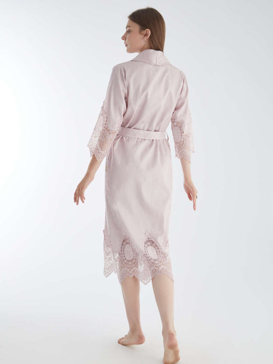 ŽAKARDINIS CHALATAS MOTERIMS SU NĖRINIAIS - BOUDOIR PUDRA - M-2XL