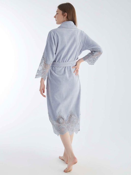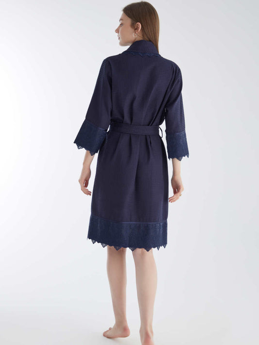 VAFLINIS BAMBUKINIS MOTERIŠKAS CHALATAS SU NĖRINIAIS - MILA BLUE - M-2XL