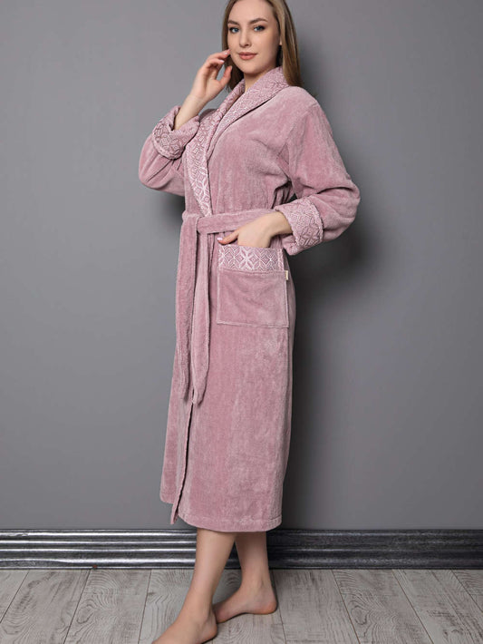 ŽAKARDINIS CHALATAS MOTERIMS SU NĖRINIAIS - BOUDOIR PUDRA - M-2XL